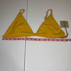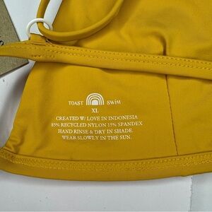 Brand new without tags Toast Swim bikini top in a sunny mustard yellow shade. Size XL. Features a minimalist triangle design with adjustable straps for a custom fit. Crafted from eco-conscious materials — 85% recycled nylon and 15% spandex. Soft, stretchy, and perfect for lounging or beach days.