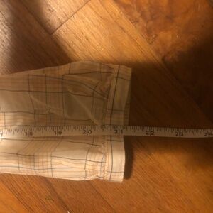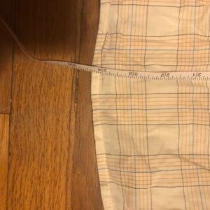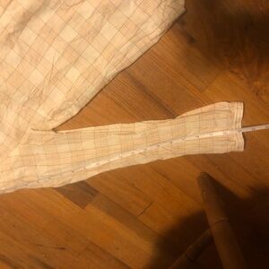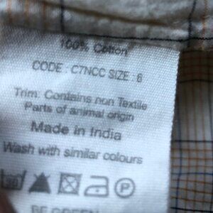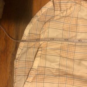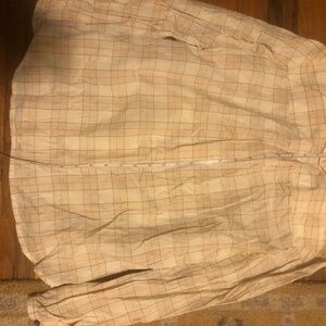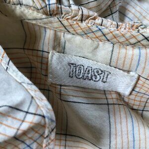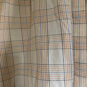 Soft cotton button-down top with ruffle collar. Subtle cream, blue, and orange plaid. Really high quality from a socially-conscious brand. UK size 6 equal to US size 2 or xs.