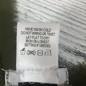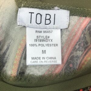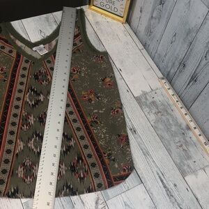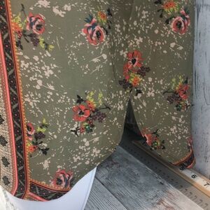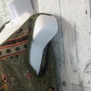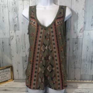 Green with multicolored design,v-neck front and back, curved hem, colors may vary due to lighting, good used condition, Sz: M