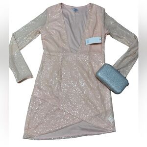 New with tags, peach fuzz turn heads in this Tobi Sequins dress. No holes, stains or missing sequins. Zips on side and has swooping tulip wrap on front.