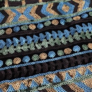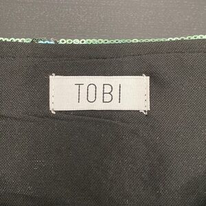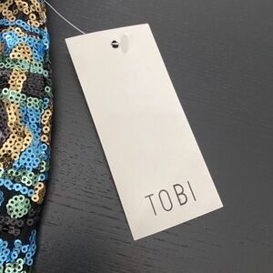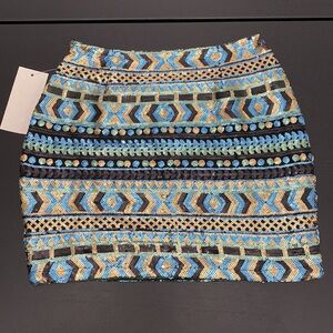 Ladies Tobi sequin geometric mini skirt. Good amount of stretch, side zipper and hook and eye closure for easy on and off. Brand new with tags, no flaws or signs of wear. Measurements shown in photos.