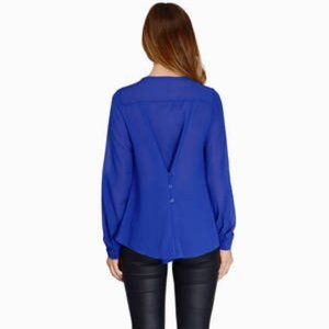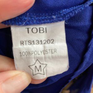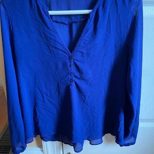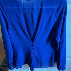 Tobi long sleeve chiffon blouse style you-belong-to-me. Excellent Condition. V-Neck. Roll up sleeves convert to 3/4 length. Nice back button detail. Cobalt Blue. Back is sheer. Front is lined.