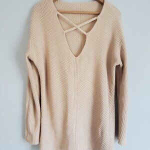 the oversized sweater dress features a criss cross front on a deep V neckline, and extra long sleeves for a chic slouchy fit. Measurements laying flat are approximately bust 22” and length 32”. 100% acrylic.rn once. Cozy and warm and perfect with black tights and boots. Color is a nud