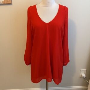 Red chiffon tunic or mini dress. V neckline. Long blousy split sleeves with elastic cuffs. Lined. 28.5” shoulder to bottom on front and 31” on back. 18.5” armpit to armpit.