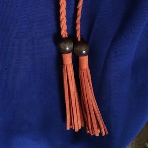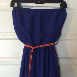This dress is a long flowy strapless dress with a high slit on the left side. It has a short dress underneath and a orange braided belt with fringe. The dress was only worn twice but still looks completely new! I can not remember if this dress if from the Tobi store from California because I did order it a few years ago but it does say Tobi on the tag.