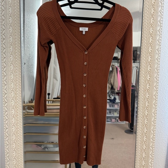 Chic ribbed dress with button-front. Long sleeves for versatile wear. Perfect for day or night.