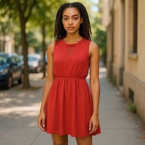 This Tobi sleeveless blouson mini dress in salmon pink is perfect for your next special occasion! In excellent pre-owned condition, this dress features a pleated chest and a unique open inverted triangle detail between the breasts. The elastic waistband and flared skirt create a flattering silhouette. Fully lined for comfort and confidence.