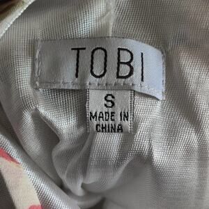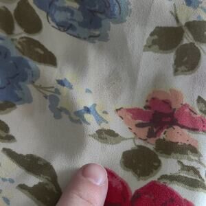 Strappy low v-back cage back cream colored dress with pink red green and blue floral print, fully lined, excellent condition