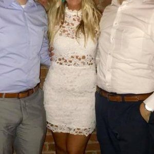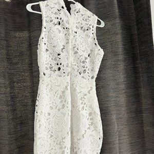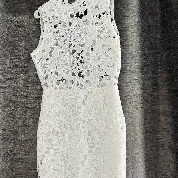 Worn 1x for my rehearsal dinner and has been professionally dry cleaned. Does not have a slit and has a hook in the back at the top of the zipper. It's see through at the bust so you'll need to wear a bandeau - I wore a white strapless one and it looked great!