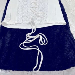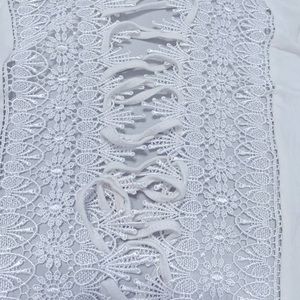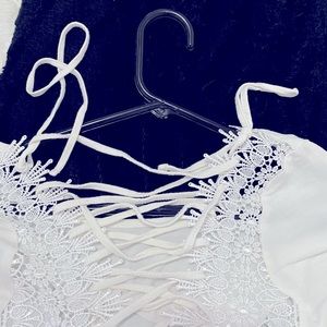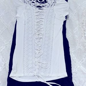 White t-shirt with embroidery and corset tie-like design on the back. Two strings on the bottom and top to tighten or loosen the shirt. Never worn.