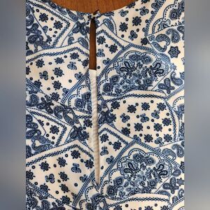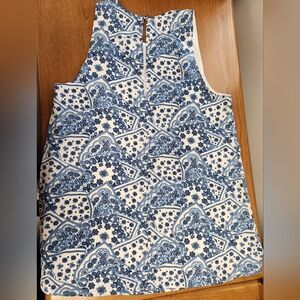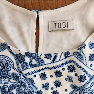 TOBI blue & white print dress. Sleeveless with button back closure with opening underneath and fully lined. Size tag is non readable. measures approx 20 pit to pit and 31 long.