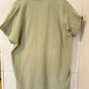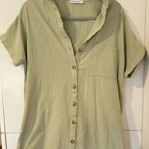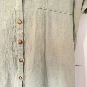 Size medium light green shirt dress. There is some very faint discoloration I didn’t even know was there until I photographed, you can barely see it (all pictured) I am 5’8 and this was a little too short for me to wear solo. If you are 5’6 or shorter it will be perfect