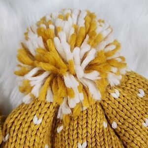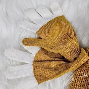 NWOT mustard yellow knit stocking cap with pom poms fringe, matching gloves and cowl neck scarf 3 piece set. Soft knit