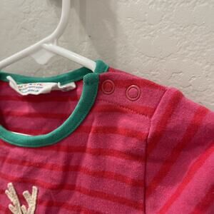 Toby Tiger long sleeve dress size 18-24 months. Hot pink and red stripe bodice featuring reindeer appliqué on front with green skirt and mushroom appliqué on back. So cute and perfect for Christmas and all winter! Very good condition - minor wash wear.