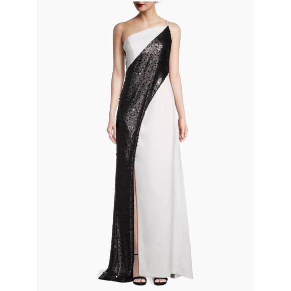 Crafted of smooth crepe, Toccin's Ava gown flaunts a one-shoulder neck and slightly flared skirt. Semi-matte sequins and a colorblocked design define this sweeping style.