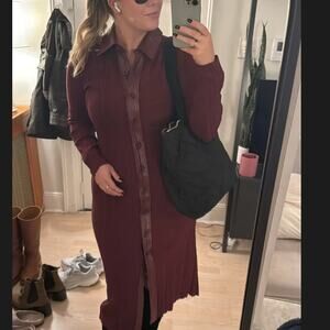 Perfect fall and winter work dress in rich burgundy with faux leather trim button front collared midi shirt dress, sophisticated and polished. Flaw see details below