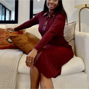 Perfect fall and winter work dress in rich burgundy with faux leather trim button front collared midi shirt dress, sophisticated and polished. Flaw see details below