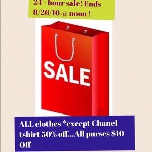 Today Only 8-25 until Noon 8-26 use offer button to take 50% off ALL clothing *EXCEPT Chanel custom Tshirts! And $10 off all bags!! 💥💥💥Hurry SALE ends soon
