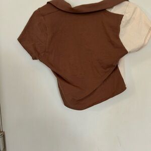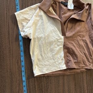 Tan and brown color block pop over crop top new with partial tag see additional pictures. This says it’s an extra large but runs on the small side. I would say a medium/large but see pictures for measurements. Thanks for looking happy shopping. Perfect for back to school shopping.