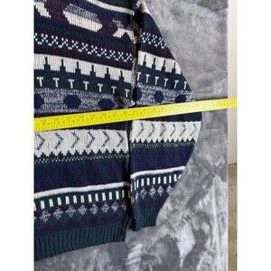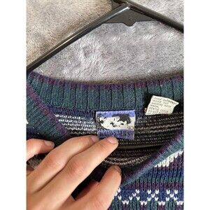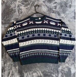 The Today's News Geometric Long Sleeve Knit Pullover in size Large is a colorful and cozy sweater perfect for casual occasions during the winter, fall, and spring seasons. Made from acrylic knit fabric, this pullover features a geometric pattern and long sleeves for added warmth and style. With a pullover style and machine washable care instructions, it is a convenient and versatile addition to any woman's wardrobe. The multicolor design adds a fun and vibrant touch to the sweater, making it a fashionable choice for everyday wear.