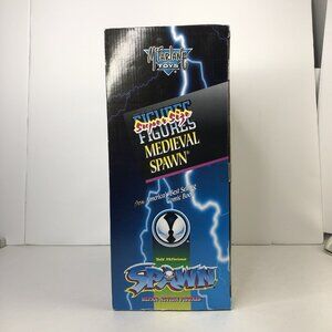 The product is a 12" Super Size Medieval Spawn action figure from the comic book series Spawn, created by Todd McFarlane. This figure is part of the Spawn franchise and comes in a boxed packaging. Made of plastic and featuring a multicolor design, this collectible item is perfect for fans of comic book heroes and action figures.