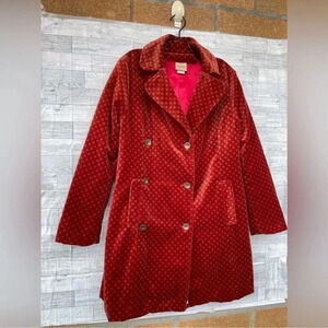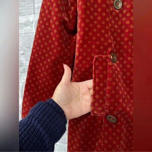 Perfect transitional piece. Velvet features subtle print. Off center button detail and lined with nylon acetate. Excellent condition. Floral print colors is like a burnt orange lining inside bright neon red no missing buttons. Hard to find in this condition runs big check on measurements for fit reference Shoulder to shoulder 20" inches Arm pit to arm pit 20' inches wide