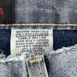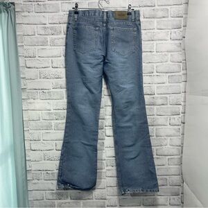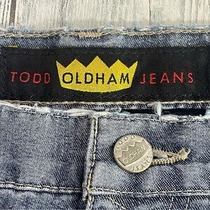 These Todd Oldham Vintage Bootcut Jeans in size 9 feature a button fly closure and a distressed denim fabric with a light wash. The mid-rise jeans have a 5-pocket design with logo accents and belt loops. The Y2K-inspired jeans have a bohemian and 80s theme, making them a unique addition to any wardrobe. They show distressing around the waist, hems (small hole in hem) and pockets. Please see all pictures to see the distressed areas. Colors may vary due to lighting, good used and loved condition, size 9