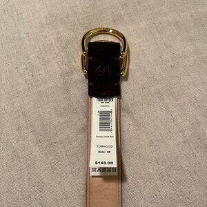 Elegant brown leather belt. Features a stylish gold buckle. Perfect for any occasion. Tags have been removed. Worn a couple of times. Excellent condition