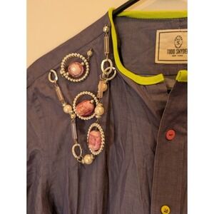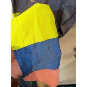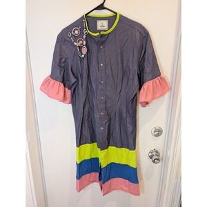 No size tag, pit to pit is 19.5 inches. A burst of playful artistry, this dress features a unique color block design with vibrant hues of blue, yellow, and pink, creating a visually striking and cheerful aesthetic. The dress is adorned with colorful buttons down the front, adding a whimsical touch to its design.