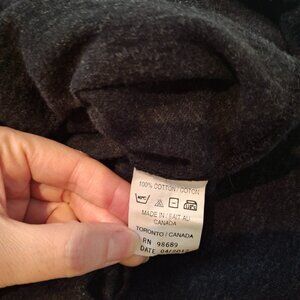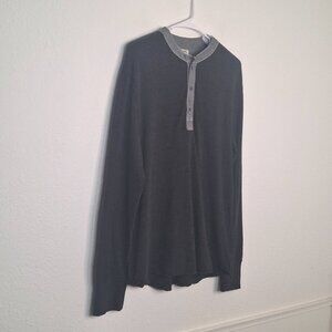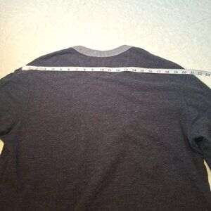 Pre-owned, good condition. No visible holes or stains. Normal signs of wear. Dark gray with lighter contrast neckline. Henley style. Long sleeves w/ cuffs. Button down collar. Lettuce hem. Lived in look. Size per tag: XL (Extra Large). Fabric: 100% Cotton. Made in Canada. Size per tag does not guarantee desired fit, please see pictures for measurements.