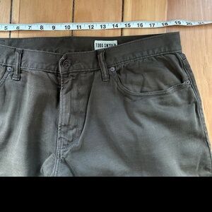 My take: Really amazing color on these and a nice soft fabric. I have several pairs of these that I wear when I want to be more comfortable vs. wearing raw denim. This dark olive color looks great with white or black shirts.