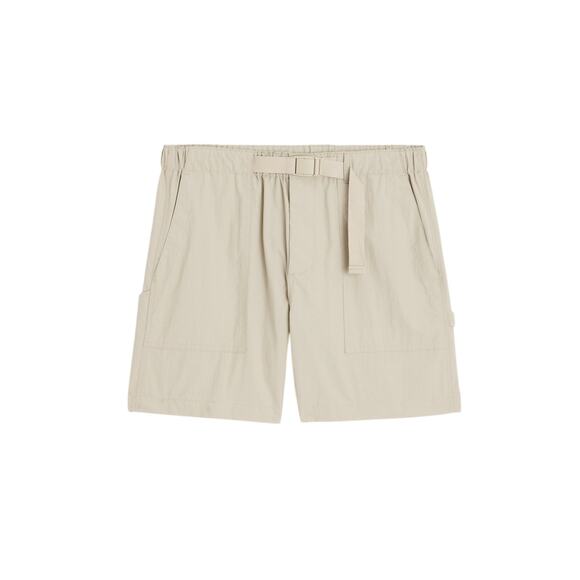 Todd Snyder X Gardenheir 6" 'Garden Work' Beige Polyamide Short Size M: lightweight, elastic waistband, zipper fly with snap closure, built-in adjustable belt, and deep camp pockets, side-entry camp pockets, tool loop at left, tool pocket at right, back patch pockets, measurements: 17 inch width x 17 inch length.
