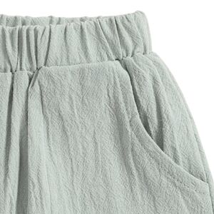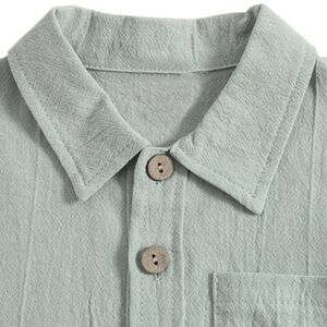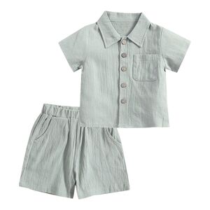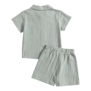 Adorable two-piece toddler outfit set in a soft sage green. Includes a short sleeve collared button-front shirt with wooden-style buttons and a matching pair of elastic waist shorts with side pockets. Made of 100% cotton with a light textured weave that feels soft and breathable—perfect for warm weather.
