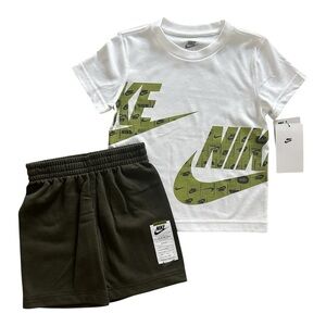 2. Nike Performance Tan/Gold Set: "Just Do It" graphic tee + mesh shorts (Size 18-24M).