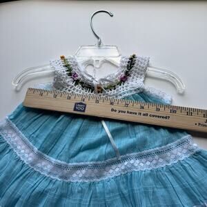 Listed size 0, Measurements in pics Appears to be size 3-6 months. Handmade in Ecuador. 100% cotton. Gauzy material, blue
