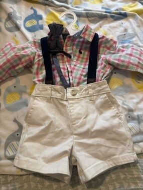The sweetest set for your little guy! Nautical beachy themed button down collared shirt with boats, anchors, starfish, waves. Paired with a pair of classic khaki cargo shorts.