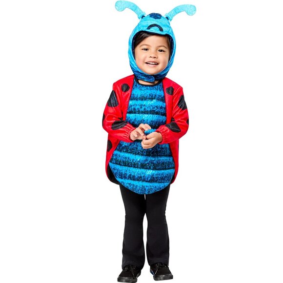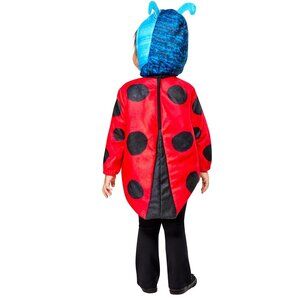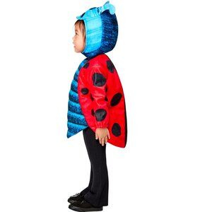 COSTUME INCLUDES: ladybug tunic with blue printed fleece front and ladybug wing printed sleeves and back, batting in tunic body, and hook-and-loop closure at back, and printed fleece hood featuring attached antennae and printed eyes, nose, and Grouchy Ladybug frowning mouth, and hook-and-loop closure under chin. Pants not included. Child wears with own pants.