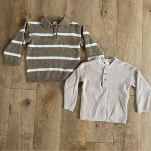 Bundle / lot of two tops total. H&M sweaters for toddler boys. Tops are in excellent condition. Neutral tones. Great for fall family photos / holidays. One dark brown with white stripes, collared with two buttons, and one light tan/cream with 3 buttons knit sweater. See all photos for details. Will ship same day or next business day.