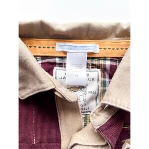 100% heavy weight cotton. Hidden placket, embroidered dog crest on the chest, adorable elbow patches, and plaid lining around the collar.