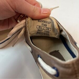 Boys loafer boat shoe in tan and beige with navy accents. Cute dress shoes for toddler boy! Great shoes for events or kids Easter shoes.