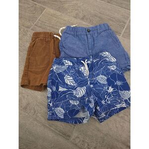 Baby boys lot of three Janie and Jack bottoms. Brown linen and cotton pull on shorts with drawstring. Blue chambray pull on shorts- linen and cotton blend. Tropical blue Hawaiian swim trunks. All size 18-24 months. All good, clean condition.