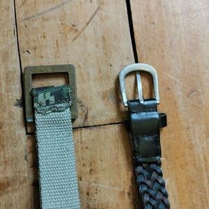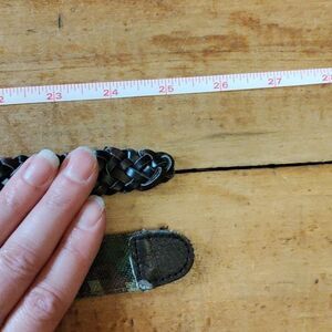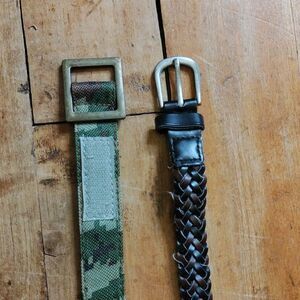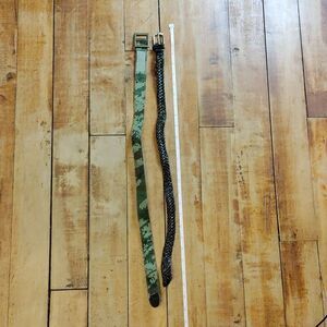 Set of two stylish belts. One features a camouflage pattern, the other is black and brown braided. Some minor fraying on inner part of braided belt-pictured