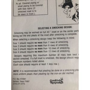 Fully lined. May be used as reversible. Appliqué and smocking designs not included. Does not include buckles.