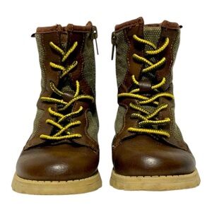 These boots are SO cute. Canvas with side zippers for entry ease. Brown and green over the ankle boots in toddler size 5