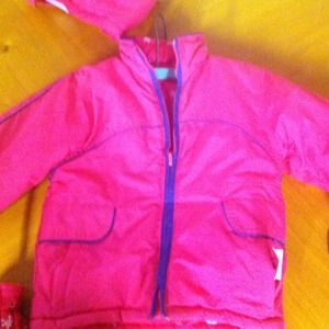 2T reversible ( other side is just pink) with a detachable hood and attached mittens!