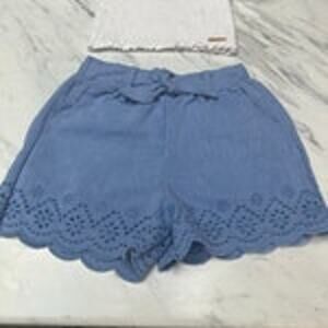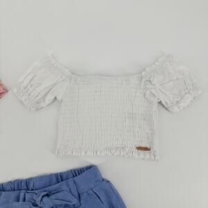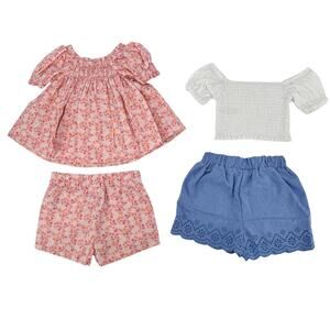 - bundle includes Cat & Jack floral blouse and short set on the left and Tahari crop top and short set on the right
