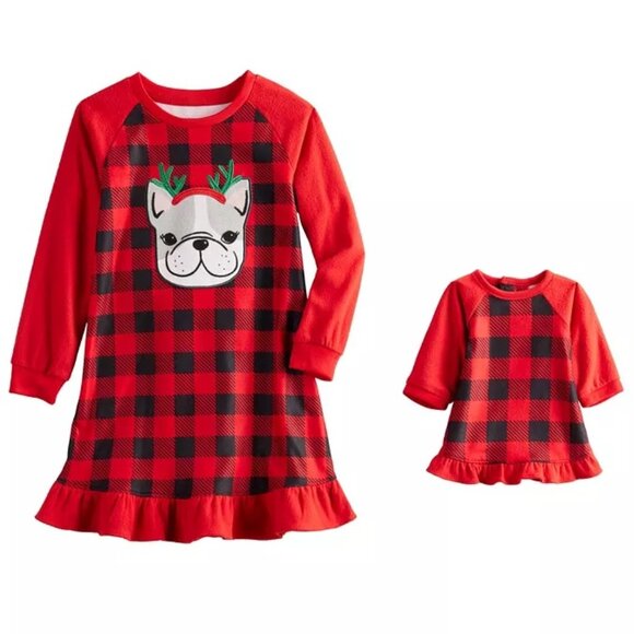 Toddler Girl CHIRSTMAS FRENCHIE DOG Checks Nightgown & Matching Doll Size 5T NWT