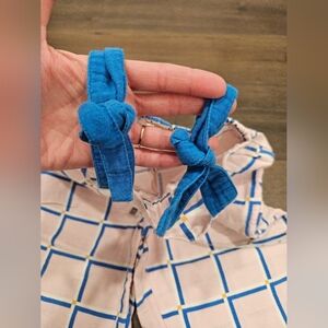 This is a gorgeous one-piece jumper in a pink and blue grid pattern. Blue tie top straps (pre-tied), wide legs, and two pockets make this linen-feeling jumper SO adorable.