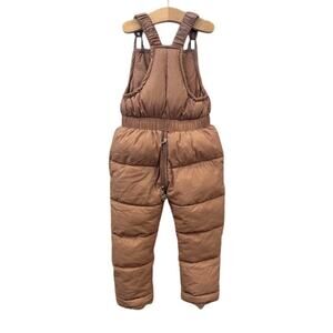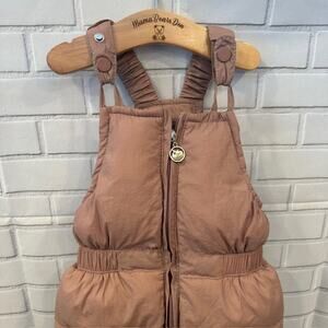 This is a durable and warm mauve pink 2-3T snow suit with stretchy suspenders that has a zipper that is helpful for diaper changes.