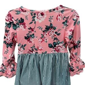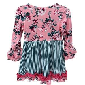 From the Boutique line of Okie & Lou comes a vintage style dress with pink roses, ruffles, stripes, and an adorable bicycle detail.